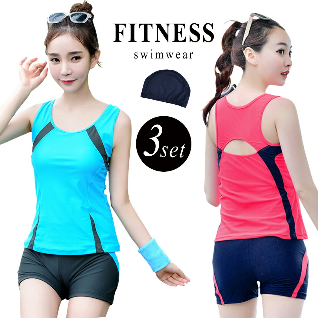 フィットネス水着 レディース セパレート 体型カバー水着 タンクトップ ショートパンツ キャップ 3点セット タンキニ水着 オトナ女子 可愛い 夏 無地 ノースリーブ ノンワイヤー お腹 太もも お尻 カバーアップ パッド内蔵 バックスリット入り ピンク ブルー 水着短パン