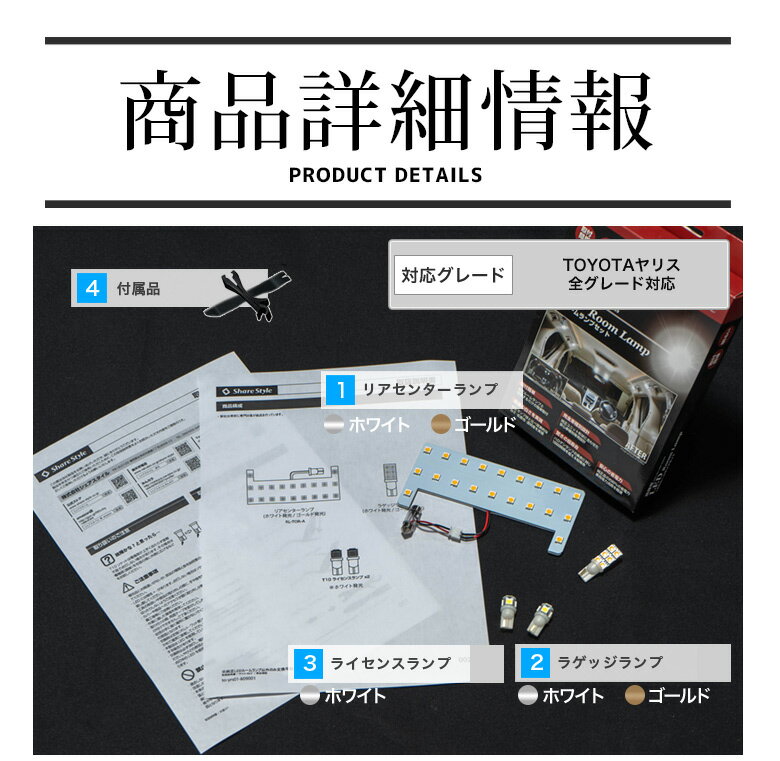 トヨタ ヤリス LEDルームランプセット[K]適合車種商品番号ヤリス MXPH MXPA10 15 KSP210to-yrs01-li09001材質カラーSMD3chipシャンデリアホワイト/ラグジュアリゴールドセット内容リアセンター+ラゲッジランプ+ライセンスランプ +内張はがし+取扱説明書保証期間 【1年保証】・・・ 詳しくは商品に同封してあります商品保証書もしくはご利用ガイドをご確認ください。